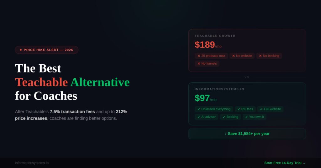 If you’re looking for a Teachable alternative right now, you’re probably one of the thousands of course creators blindsided by Teachable’s June 2025 pricing overhaul. Plans were renamed, prices jumped, product limits were slashed, and a new 7.5% transaction fee appeared on the Starter plan. Some users reported cost increases of over 200%. This guide breaks down what happened, why coaches are leaving, and why InformationSystems.io has become the go-to Teachable alternative for coaching businesses in 2026.